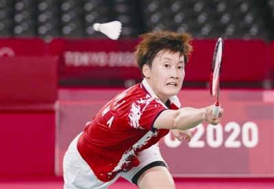 | 羽毛球女子单打决赛中,中国选手陈雨菲以2:1战胜中国台北运动员戴资颖,获得冠军。图为陈雨菲在决赛中。 |