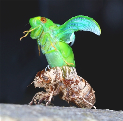 不少人认为蝉是树上长、林中飞、会唱歌的虫子。其实,雌蝉交配后在树枝上产卵,然后落地入土,幼虫在地下生活数年后,再钻出地面,上树脱壳鸣叫求偶、交配产卵,开始生命的又一次新的轮回。盛夏雄蝉鸣叫是求偶行为,目的是为了繁殖后代。雄蝉的发音器在腹肌部,像蒙上了一层鼓膜的大鼓,鼓膜受到高频率振动而发出声音,所以其鸣声特别响亮。雄蝉能发出3种不同的鸣声,并且能轮流利用各种不同的声调激昂高歌。