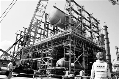 8月4日,在安庆石化炼油二部新建Ⅲ套硫黄回收扩能改造项目建设现场,施工人员错开老装置停工检修加装酸性气盲板的时间,冒着高温将核心设备加氢还原反应器R4003吊装就位。曾雅艳 摄