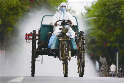 | 河南省正阳县城,防疫人员利用农用打药车在城区进行环境消杀工作。 |