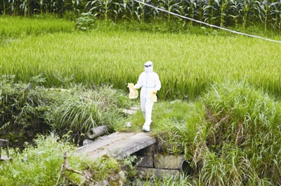 | 湖南张家界,罗进武和向卡是当地中医医院的一对医护夫妻。罗进武行走在乡间小道上,上门为行动不便的村民进行核酸检测。 |