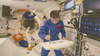 神舟十二号飞行乘组已经在轨工作2个多月,计划九月中旬返回。那么,3位航天员在遥远的太空是怎么生活的呢?其实,他们的娱乐生活还是丰富多彩的,可以跑步健身、听音乐、打乒乓球,还可以看精彩的视频。图为神舟十二号航天员刘伯明正在练习太空书法。