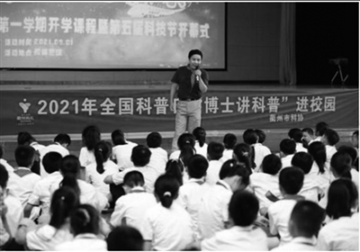 | 2021年全国科普日“博士讲科普”进校园活动,图为中国科学院大学杨建辉博士在江山恒泰学校进行科普讲座。(浙江衢州市科协供图) |