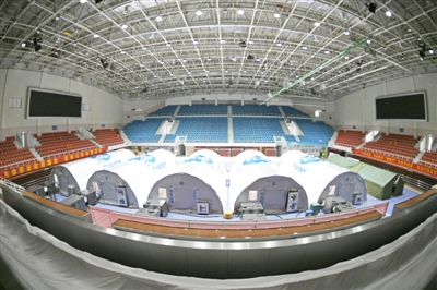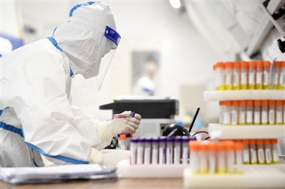 10月26日,经过20多小时的紧张搭建,一组五舱合一的“猎鹰号”硬气膜实验室在宁夏银川体育馆正式投入使用。该气膜实验室日最高检测量可达8万管,按10混1采样方式,每天最多可检测80万人,这也是进驻宁夏的首个气膜实验室。“猎鹰号”硬气膜实验室将在银川市第二轮核酸检测工作中发挥重要作用。图1:工作人员在“猎鹰号”硬气膜实验室样本处理区作业。图2:工作人员在“猎鹰号”硬气膜实验室样本处理区登记样本试管。图3:位于宁夏银川体育馆的一组五舱合一“猎鹰号”硬气膜实验室。 新华社记者 王 鹏 摄