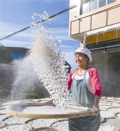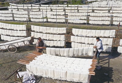 | 浙江省温岭市石桥头镇大力发展“一村一品”产业,米面加工户从“单打独斗”到“抱团成长”,进一步激发产业发展活力,带动村民增收致富,助推乡村振兴。图为米面加工专业合作社社员在晾晒米面。 |