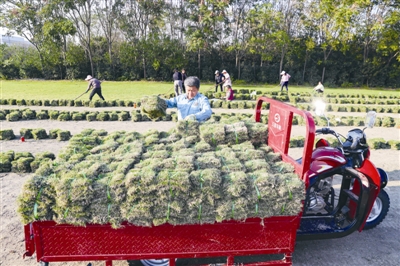 | 江苏南通如皋市如城街道钱长村年种植草坪3000多亩,销往全国各地,亩效益超万元,有着“江苏草坪第一村”之称。图为农民正在装运销往各地的草坪。 |