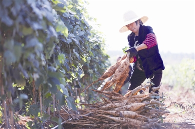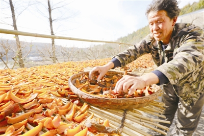 | 湖北省十堰市房县充分发挥红薯资源优势,依托“公司+专业合作社+农户”模式,将低廉的红薯疙瘩加工成红薯干、红薯粉、红薯粉条,提高附加值,产品每斤销售价格提高11倍。如今,红薯疙瘩通过“变身术”,深加工上市产品成了农民增收致富的“金疙瘩”。图为农民在晾晒红薯干。 |