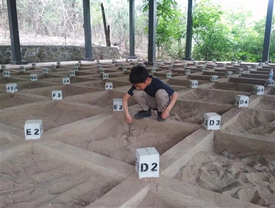 除挖掘出学术价值巨大的古人类头骨外,裴文中还对周口店的考古方法做出改革。1931年以前,周口店的采掘以“散挖”为主。1932年,裴文中借鉴当时安阳殷墟和西阴村的发掘方法,改进“散挖法”,采用探沟和打格分方相结合的方式,先挖掘一个探沟,宽1.5米,以3米为一段,共四五段,根据所得地层的知识,确定挖掘区,再将发掘区划分为3米×3米的方格,并以此为坐标对出土物进行位置标记。开至5米之深后,再另作探沟。这种方式效率更高,且方便考古人员更好地记录出土遗物位置和地层,也有利于开展后期研究。为了让游客感受数十年前考古工作者的真实工作情景,遗址公园专门设置了“打格分方”模拟考古挖掘区(图2),并事先埋好数量不等、分布不均的史前动物骨骼化石模型供游客“发现”。