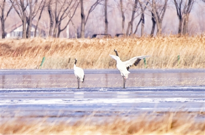 12月5日,记者从北京延庆区获悉,冬奥赛区又添生态美景:一对“神仙眷侣”丹顶鹤首次造访北京延庆野鸭湖畔,冬奥延庆赛区生物多样性再添新证。丹顶鹤被列入《世界自然保护联盟濒危物种红色名录》,为濒危物种,系国家一级保护动物。