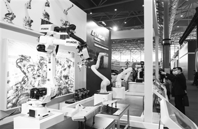 | 11月19日,观众在2021世界制造业大会上观看展出的智能工业机器人。 新华社记者 韩旭 摄 |