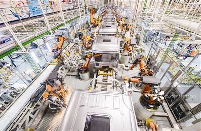 | 陕汽积极发挥企业创新主体作用,充分借助“秦创原”平台资源、技术和人才优势,进一步激发了企业发展动能。图为工业机器人在陕汽控股车身厂HD机器人生产线上作业。 |