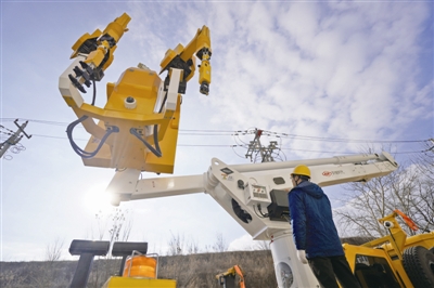 | 配电网带电作业机器人是一种能够在高空带电线路上进行作业的特种机器人,工作人员可通过地面控制室遥控机器人完成线路上的带电作业,能有效降低安全风险,提升作业效率,使带电作业智能化、常态化。图为山东烟台首次使用配电网带电作业机器人,成功对线路进行了不断电维护作业。 |