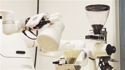 | 冬奥场馆内,一个叫作“制咖大师”的机器人能够在4分钟内制作一杯热腾腾的手冲咖啡。 咖啡萃取完毕之后,它的右手会将咖啡放到指定位置,左手便开始清理咖啡渣、冲洗器具,整个流程一气呵成。 |