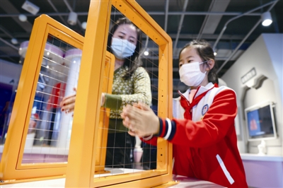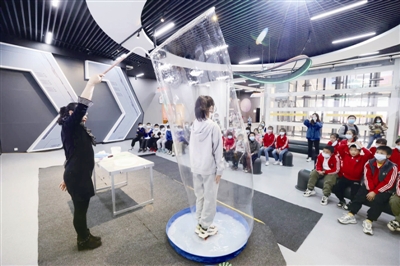| 山东省滨州市积极探索学校教育与科普场馆教育相结合的育才模式,积极组织开展“科普课堂 助力‘双减’”活动。图为滨城区清怡小学的孩子们在老师带领下来到当地科技馆,体验科普装置,学习科学知识。 |