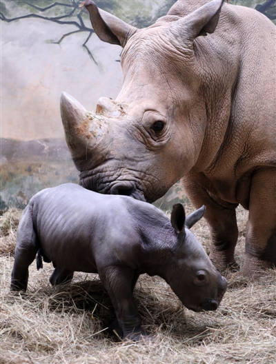 3月29日,广州长隆野生动物世界的白犀牛“维维”成功产下一头雄性幼崽,目前新生幼崽已顺利吃上母乳,健康状况良好。