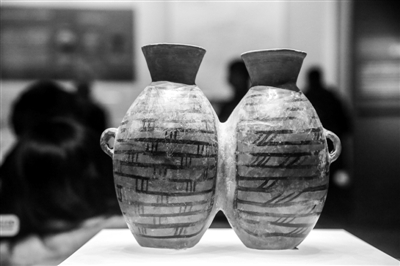 | 图1:河南三门峡,实拍仰韶博物馆。 图2:彩陶双连壶,新石器时代仰韶文化(距今7000—5000年),1972年郑州市大河村出土。红衣黑彩的两壶体并列连接,腹部相接处有一椭圆形口相通。这种饮酒器皿在当今少数民族中仍有沿用,两人各衔一壶同时饮用,以作为友好、团结、联合及爱情的象征。(视觉中国供图) |