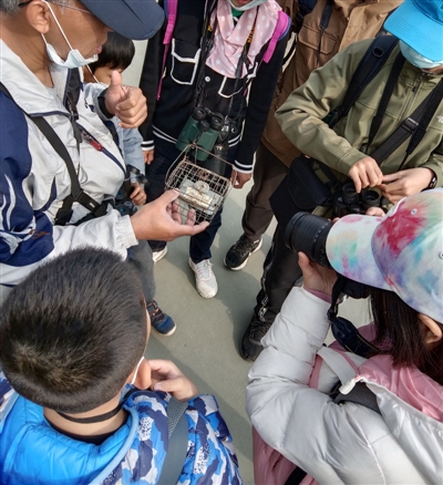 | 学生们在观察抓鸟的小铁笼 (图片由作者提供) |