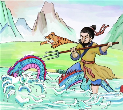 在《晋书·周处》传里,记载了一个故事:三国时期,在吴国有个叫周处的人,喜欢骑马射箭,臂力惊人,但脾气很暴躁,经常殴打别人。他很小就失去了父亲,母亲也难以管束他,乡亲们都很怕他。当时,附近的河里有条蛟龙,山上有只白额虎,它们一起祸害百姓,人们把周处与龙、虎并称为“三害”。有人故意“忽悠”周处去杀死老虎和蛟龙,其实是希望他们能自相残杀,一举除“三害”。周处先上山去杀了老虎,又下河去斩杀蛟龙。过了三天三夜,乡亲们看他没有回来,都以为他死了,就聚在一起庆祝。