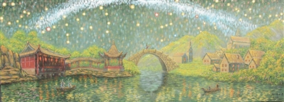 《诗意星空》中的不少创新亮点,皆堪细细品味。现再以《同一片星空》为例略述一二。此画尺幅120×50厘米,画面两侧通过一座桥梁连接。左侧是东方园林,右侧是西方建筑。桥上有两个人,他们是徐光启和利玛窦,象征中西方文化的交流。该画取灰色调,明暗对比和冷暖色对比都不强烈,有点迷茫的感觉。这其实表达了画家对历史的惋惜:明末意大利传教士利玛窦来华,已经把西方当时的许多科技书籍和知识带入中国。其时中西方科技差距尚不很明显。可惜明末动乱,徐光启、利玛窦翻译的书籍未能及时传播;大清帝国长期闭关自守,错失跟上世界近现代科技发展的机遇。从《同一片星空》中很能看出画家的这种心境。