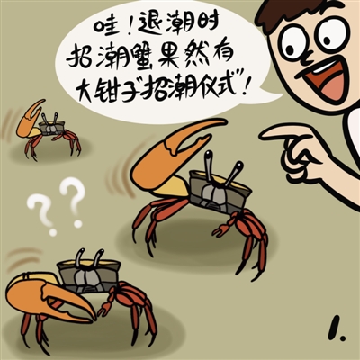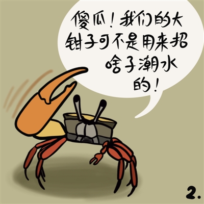 招潮蟹属于沙蟹科。其最大特征就是雄蟹有大小悬殊的一对螯,大螯用来示威打架求偶,小螯用来觅食。