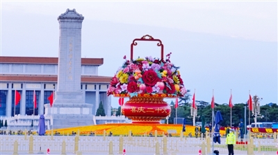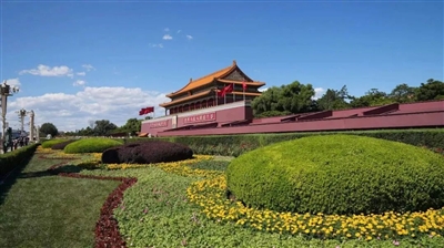 10月16日,为庆祝党的二十大胜利召开,天安门广场大花篮和长安街沿线部分花坛景观转换工作完成,花坛文字转换为“喜庆二十大”。