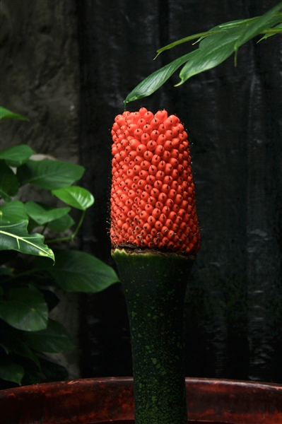近看巨魔芋的果实,俨然是用一个个橘红的枇杷果排列组合成的艺术品——拥有两组螺旋线,一组顺时针方向盘绕,另一组则逆时针方向盘绕,并且彼此镶嵌,完美吻合了一个奇特的生命数列——著名的斐波那契数列,也叫“笛卡儿叶线”。