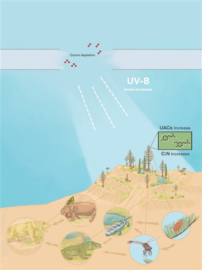 | 臭氧层破坏引起的紫外线辐射增加对陆地食物链的影响。 (图片来源:中科院南京地质古生物研究所) |
