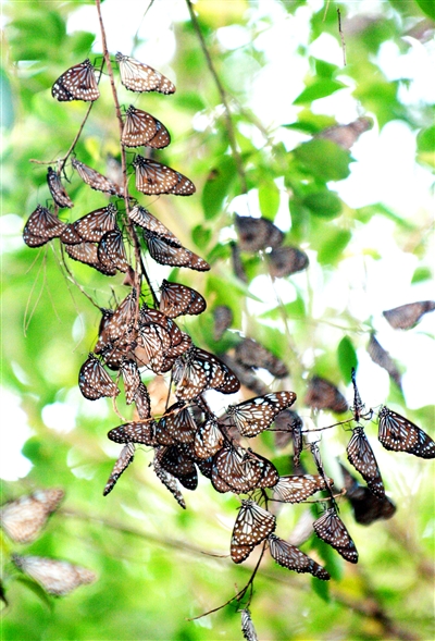 我国有近2000种蝴蝶,过冬的方式大多是变成蛹冬眠,也有不少是成虫越冬的,一些地方甚至会出现成千上万只蝴蝶集体越冬的盛况。在广东省珠海市最西南端一座名为“荷包岛”的小岛上,每年冬天都会有成千上万只蝴蝶在此集体越冬。这些聚集的紫斑蝶、幻紫斑蝶、蓝点紫斑蝶、青斑蝶、拟旖斑蝶和虎斑蝶等蝶群,会在此待上3个月时间,静候春天的到来。