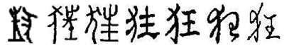 先来看“狂”。从字形看,甲骨文的“狂”是由“犬”和“?”两个部分组成,其中“犬”表示意义(“狂”的意义与“犬”有关),“?”表示读音(“?”的读音huáng和“狂”的读音kuáng接近),后来“犬”被“犭”代替、“?”被“王”代替。楷书中“狂”的写法是现在的通行写法。