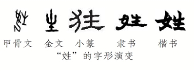但甲骨文的“姓”往往用作女性的名字,当时还没有“姓氏”义。金文的“姓”字开始写成“生”,到了春秋时期才加“亻”,并且可以作为“姓氏”意义的专用字使用了。后来的字体演变中,保留了“女”和“生”两个部分。根据考古学的资料发现,西周铜器的铭文中所见的姓有不少是带“女”字旁的字,如“姜、姚、姒、姬、娲、婢、妊、妃、妤、嬴”等。由此可见,“姓”带女字旁,也并不是偶然的。