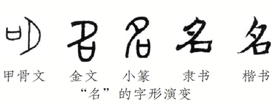 再来看看“名”。“名”在甲骨文中就已经出现,由“口”和“夕”两部分构成。“口”表示嘴,“夕”表示晚上。《说文解字》对“名”的解释是:“名,自命也。从口,从夕。夕者,冥也。冥不相见,故以口自名。”我国古人常常是“日出而作、日入而息”,在晚上看不清的情况下,可以通过说出自己的名字与对方进行沟通。