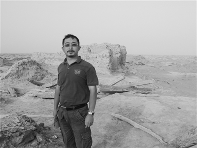 | 2010年10月4日傍晚,迷路前的探险家彭绪洛在楼兰古城废墟遗址著名的“三面墙”前留影。 (图片由作者提供) |