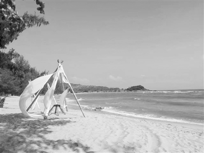 我们脚踏的这片海滩,像是游人露宿的营地,散落着各色帐篷、房车、木屋、吊床、酒吧和沙滩摩托。靠近海水的“荒野沙滩酒吧”拽住了我们的脚步,游客们点好啤酒、凤梨汁、水果、小吃,各自开始了自己喜爱的活动。有的躺在松软的气垫上休憩,有的在沙滩上悠闲漫步,有的卡拉0K舒展歌喉,有的面对大海忘情拍照,还有的骑上滑板扑进波涛冲浪……