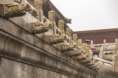 故宫主体建筑“三大殿”建在三层高大的石基上,基座台面一致向外侧稍倾,便于雨水下注,台基的上千个“螭首”作为出水口,将积水“吐”至地面,即所谓“千龙吐水”。