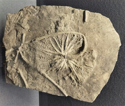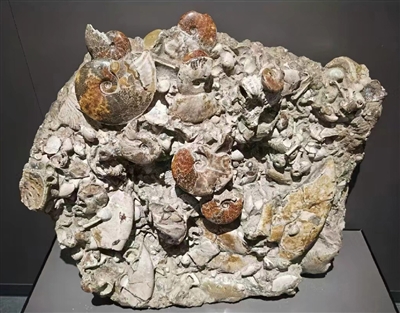 我们还看到了琥珀里的蚂蚁和蟑螂(距今约9000万年),形象鲜明逼真的蝙蝠虫,一个“大杂烩”——菊石类、双壳类、腕足类和腹足类软体动物集合体,还有容易搞错品类的粗菊石和创孔海百合——它们咋一看像是植物,其实都属动物。