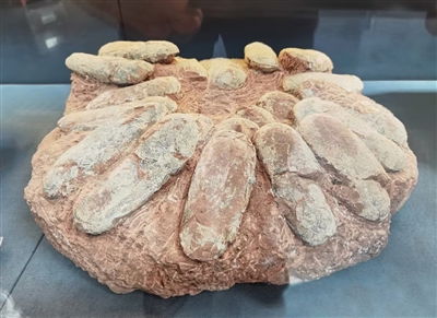 | 图1为菊石类、双壳类、腕足类和腹足类软体动物集合体化石。 图2为丘疹关杨虫化石的两个切面。 图3为一“盆”恐龙蛋化石。 图4为创孔海百合(一种棘皮动物)化石。 图5为马门溪龙骨骼化石。 |
