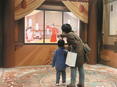 左图为观众在体验脑电波协奏曲,上图为小朋友在观看中国古典乐器演奏情景动画。