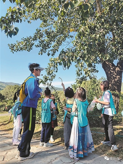 我和小伙伴们走着走着,看到一棵树上挂着牌子,写了个“楸”字。楸的叶子像个等边三角形,和杨树的叶子有点像。刘老师说,楸树质地坚硬,古代琴棋书画中的棋子就是用楸木做的。