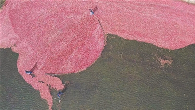 最近,一张蔓越莓鲜果漂浮在水上的照片(如上图)引发网友关注:“原来那一片一望无际的‘红色海’是咱们蔓越莓的种植基地。”李峰介绍,蔓越莓的根生长在沙土中,到了收获季就需要注水,然后通过机械水车在水面搅动,让果子从藤蔓上脱落。这样就出现了果子漂浮在水面上的“红色海”景观。