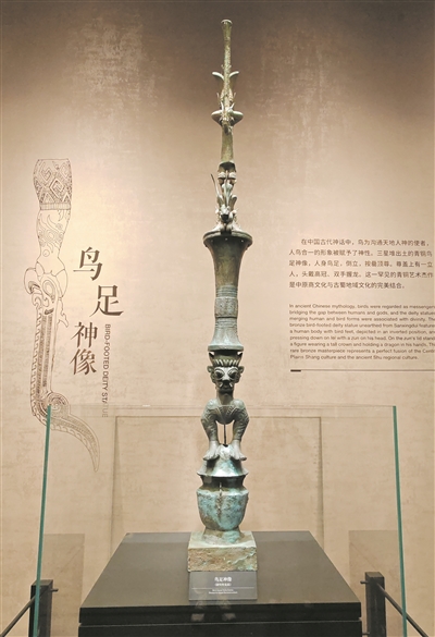 | 三星堆博物馆新馆拍摄的青铜鸟足神像(研究性复原)。 新华社记者 童芳 摄 |
