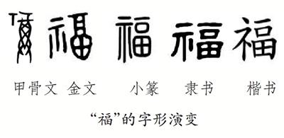 甲骨文的“福”是由祭祀的台子和用双手捧着的盛酒容器组成的,用手把酒供奉在神仙或者祖先的祭台,表示祈求神祖保佑。在金文、小篆和隶书中,双手消失,祭台变成了“示”的写法,盛酒容器改成了“畐”。在“福”的楷书中,“礻”是“示”的变形,代表祭台,表示意义。“畐”读fú,既表示“福”的读音,又用来表示“丰富”的意思,因为古人习惯用酒象征生活丰富多彩。“福”本来的意思是“保佑”,后来又发展出“幸运”等意思。