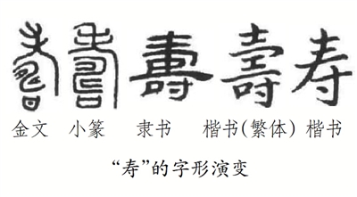 “寿”的金文字形是由“老”字的上半部分和“畴”的早期写法两个部分组成。后来“老”的上半部分开始符号化,下面又加上了“口”“寸”等部件,写法非常丰富,不过楷书简化字的“寿”写法在唐代已经出现。