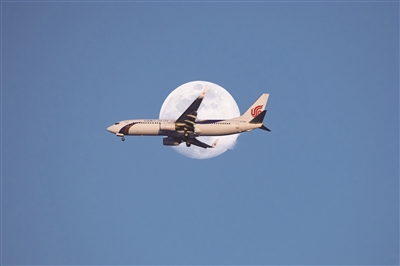 2月22日,一架波音737-800型飞机从南宁飞抵北京首都国际机场。降落前飞机划过月面,形成“飞机凌月”现象。视觉中国供图