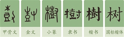 阳春三月,风日晴和,春暖花开,正是植树的好时节。“树”这个字很有意思,它的甲骨文像手持树苗栽种在盆子里的样子,本义就是种植树木。金文中,树苗样子有所变形。有的篆文中增加了“木”,强调种植的是树;同时把手形写成了“寸”,“寸”也表示手。在汉字简化时,人们用“又”代替了笔画复杂的中间部分,保留了左边的“木”和右边的“寸”,就变成了现在的“树”字。