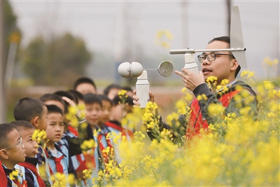 3月23日是第64个世界气象日。图为3月21日,江西省吉安市泰和县气象局气象科普志愿者正在给学生讲解气象知识,迎接世界气象日。视觉中国供图