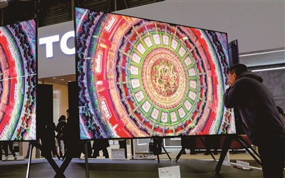 | 3月14日,AWE2024在上海开幕。图为观众在展台近距离观察一款电视展品。 新华社记者 方喆 摄 |