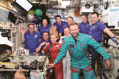 | 图为女主角尤利娅在国际空间站内与导演克利姆和航天员们合影。在太空失重环境下,尤利娅的头发漂浮着。 (本版图片由中国科普作家协会科学与影视融合专业委员会提供) |