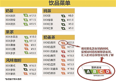 | 上图为上海饮料“营养选择”分级标识表。 下图为部分饮品菜单。 (上海市疾病预防控制中心供图) |