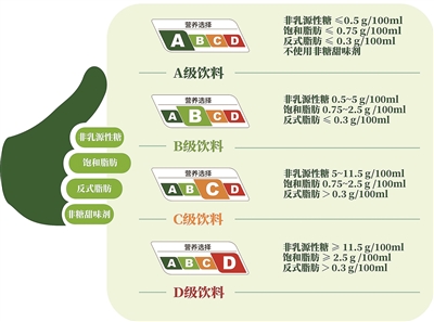 标识分为ABCD四个等级,主要根据饮料中非乳源性糖、饱和脂肪、反式脂肪、非糖甜味剂的含量,对饮料进行综合分级。比如,“营养选择”分级标识将糖的界限值分三档:0.5克/100毫升、5克/100毫升和11.5克/100毫升。