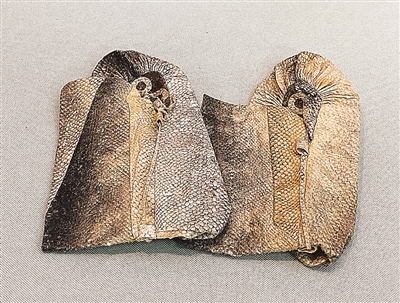 选鱼皮、剥鱼皮、阴干、涂浆、鞣制、剪裁……用鱼皮制作衣物工序复杂。展柜中展出了一双“鱼皮鞋”,俗称“鱼皮乌拉”,是冬用靴,主要采用怀头、哲罗、细鳞等优质鱼皮精心制作而成,分身、脸、靿(yào)三部分。这种鞋不仅外观别致,还轻巧灵活、防滑保暖。赫哲族人冬季狩猎时,在鞋内絮上乌拉草,外用鱼皮绑腿裹紧系牢,便可穿越风雪,征服严寒。